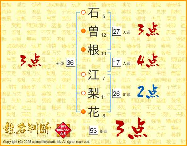石(5画)曽(12画)根(10画) 江(7画)梨(11画)花(8画)