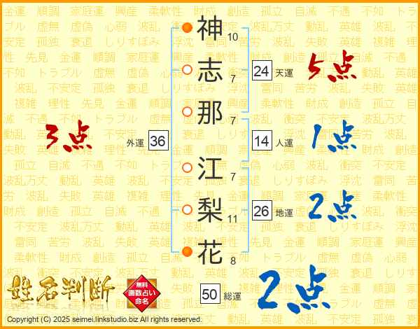 神(10画)志(7画)那(7画) 江(7画)梨(11画)花(8画)