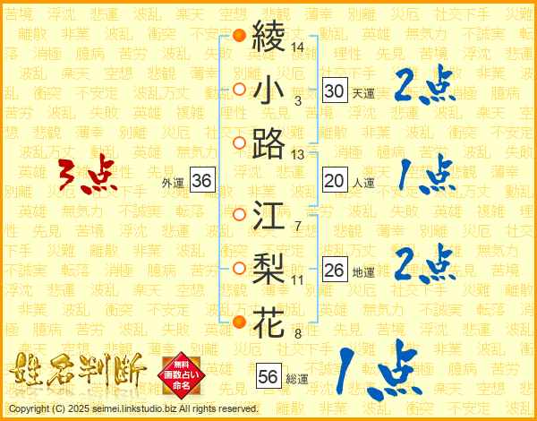 綾(14画)小(3画)路(13画) 江(7画)梨(11画)花(8画)