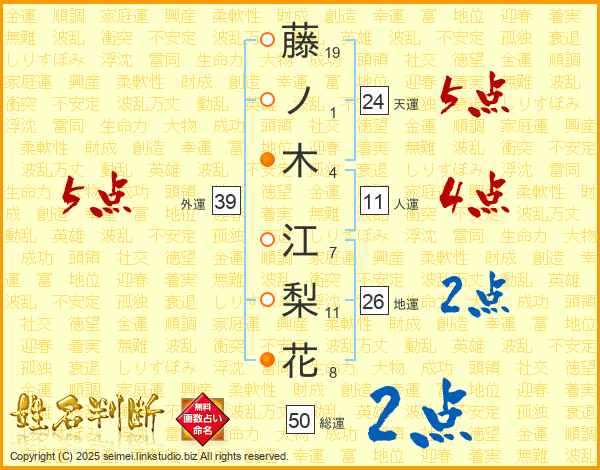 藤(19画)ノ(1画)木(4画) 江(7画)梨(11画)花(8画)