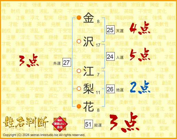 金(8画)沢(17画) 江(7画)梨(11画)花(8画)