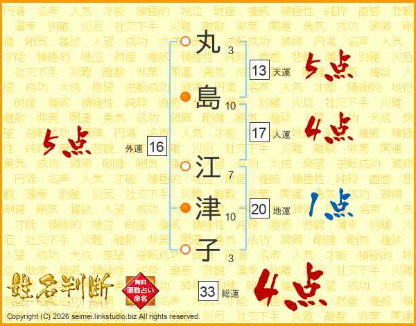丸(3画)島(10画) 江(7画)津(10画)子(3画)