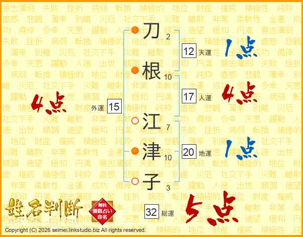 生活面を象徴する運勢です。外部から受ける影響力を表し、結婚運、家庭運や職場、環境への順応性を表します。総運から人運を引いた画数。姓や名が1文字の場合を除く。