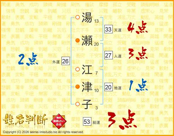 湯(13画)瀬(20画) 江(7画)津(10画)子(3画)