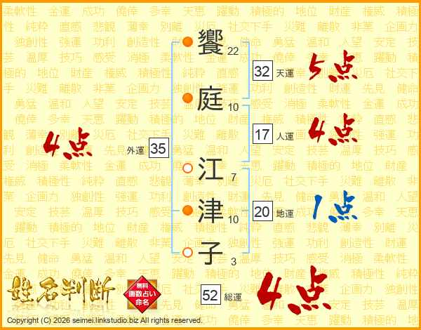 饗(22画)庭(10画) 江(7画)津(10画)子(3画)