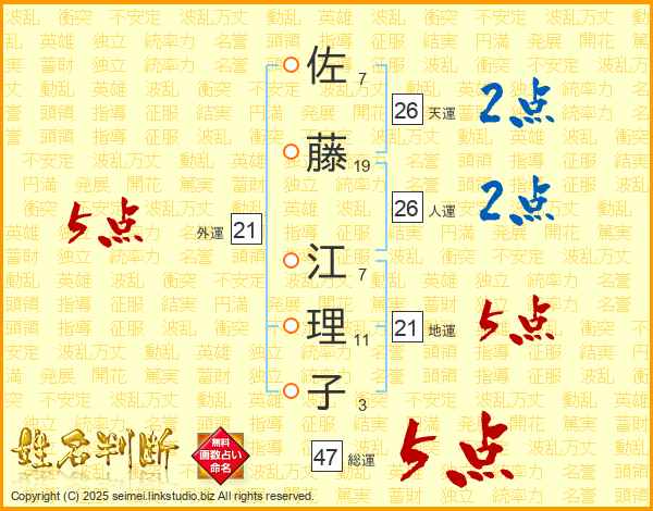 佐(7画)藤(19画) 江(7画)理(11画)子(3画)