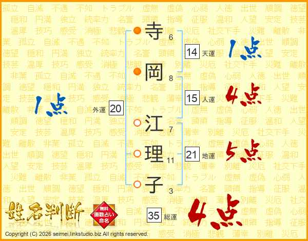 寺(6画)岡(8画) 江(7画)理(11画)子(3画)