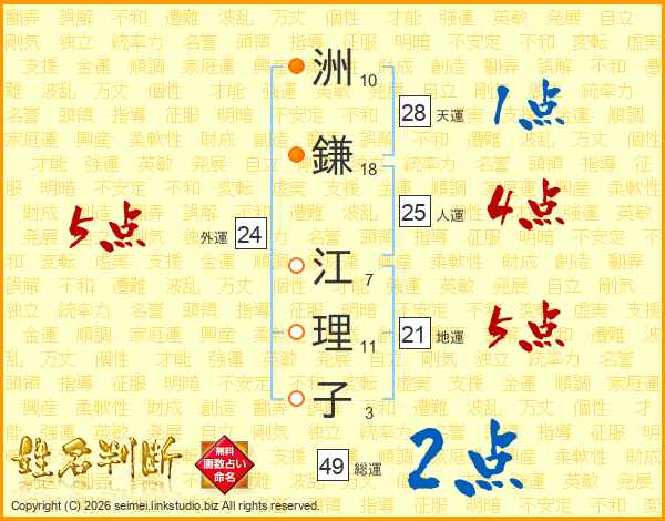 洲(10画)鎌(18画) 江(7画)理(11画)子(3画)