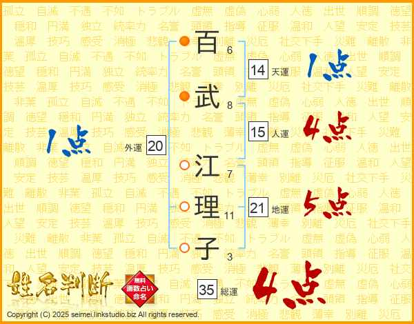 百(6画)武(8画) 江(7画)理(11画)子(3画)