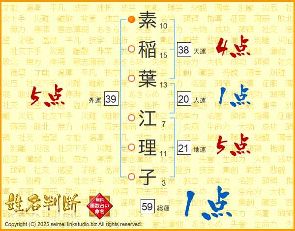 素(10画)稲(15画)葉(13画) 江(7画)理(11画)子(3画)