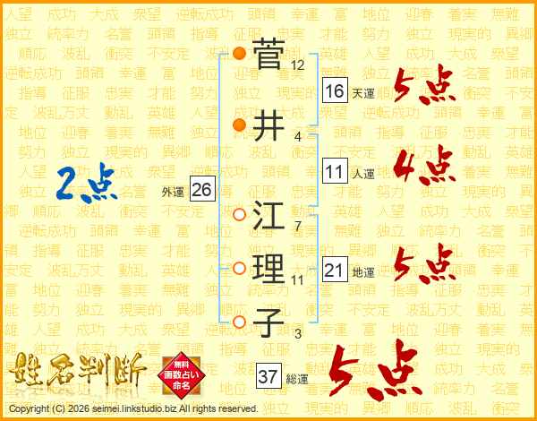 菅(12画)井(4画) 江(7画)理(11画)子(3画)