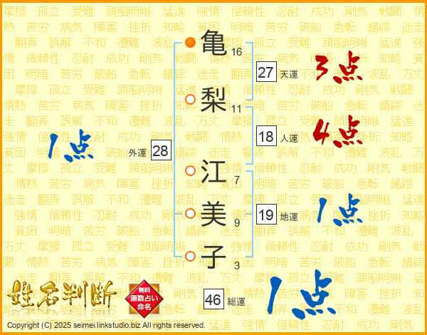 亀(16画)梨(11画) 江(7画)美(9画)子(3画)