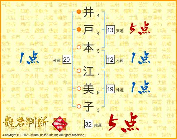 井(4画)戸(4画)本(5画) 江(7画)美(9画)子(3画)