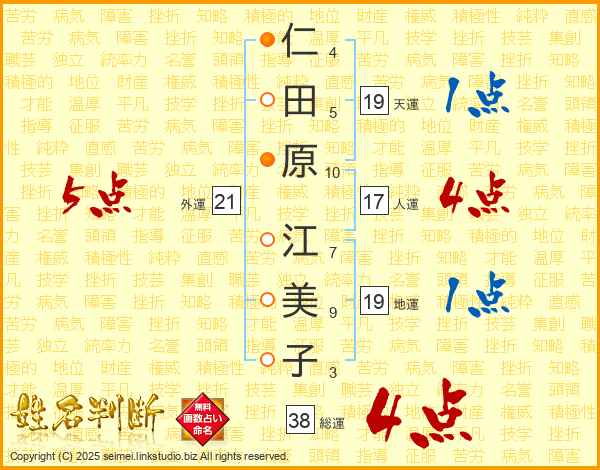 仁(4画)田(5画)原(10画) 江(7画)美(9画)子(3画)