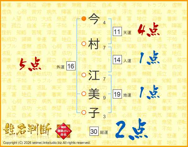 今(4画)村(7画) 江(7画)美(9画)子(3画)