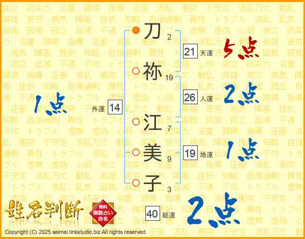 刀(2画)祢(19画) 江(7画)美(9画)子(3画)