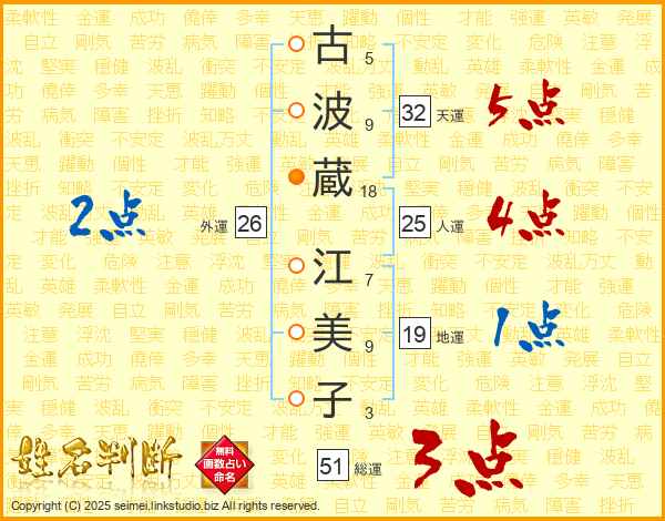 古(5画)波(9画)蔵(18画) 江(7画)美(9画)子(3画)
