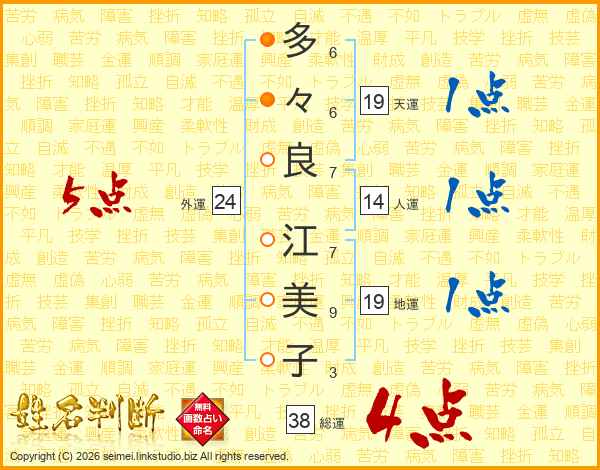 多(6画)々(6画)良(7画) 江(7画)美(9画)子(3画)