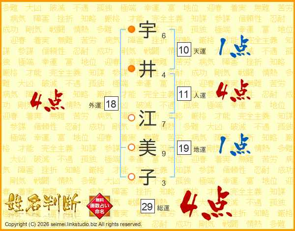 宇(6画)井(4画) 江(7画)美(9画)子(3画)