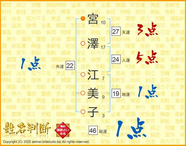 宮(10画)澤(17画) 江(7画)美(9画)子(3画)