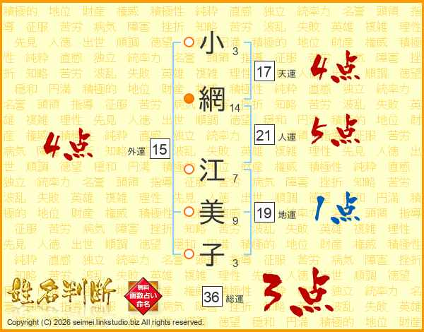 小(3画)網(14画) 江(7画)美(9画)子(3画)