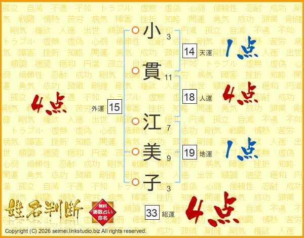 小(3画)貫(11画) 江(7画)美(9画)子(3画)