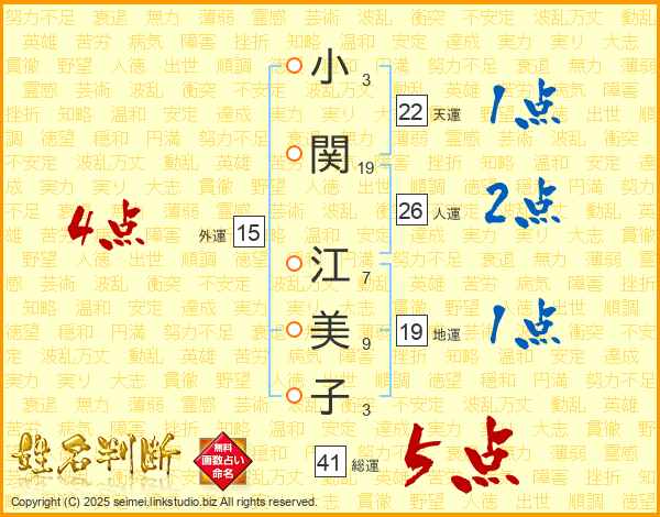 小(3画)関(19画) 江(7画)美(9画)子(3画)