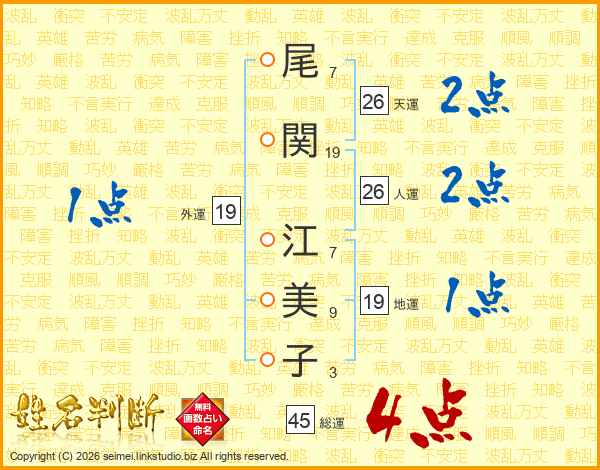 尾(7画)関(19画) 江(7画)美(9画)子(3画)
