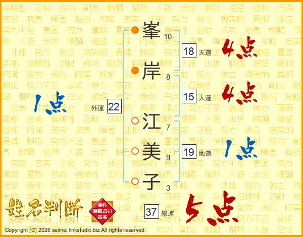 峯(10画)岸(8画) 江(7画)美(9画)子(3画)