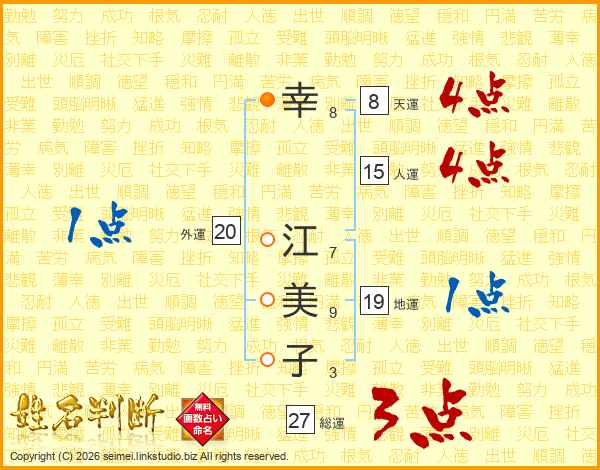 幸(8画) 江(7画)美(9画)子(3画)