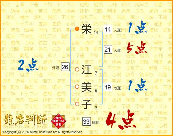 栄(14画) 江(7画)美(9画)子(3画)