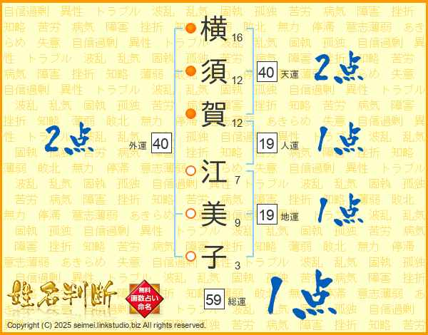 横(16画)須(12画)賀(12画) 江(7画)美(9画)子(3画)
