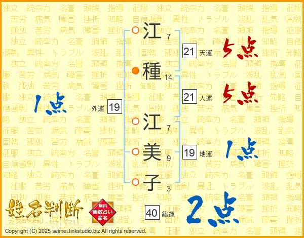 江(7画)種(14画) 江(7画)美(9画)子(3画)