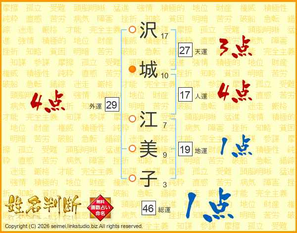 沢(17画)城(10画) 江(7画)美(9画)子(3画)