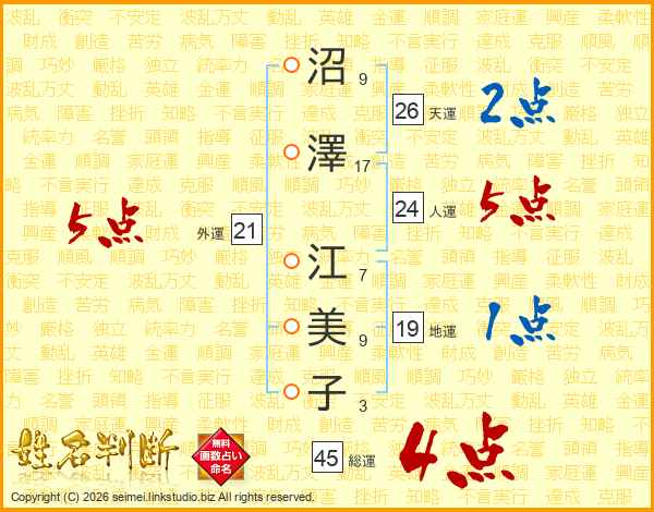 沼澤江美子さんの総運は45画の4点!