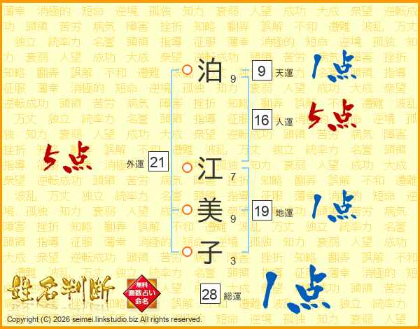 泊(9画) 江(7画)美(9画)子(3画)