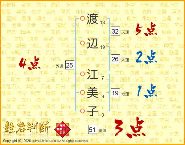 渡(13画)辺(19画) 江(7画)美(9画)子(3画)