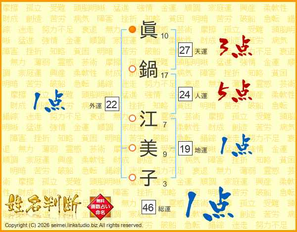 眞(10画)鍋(17画) 江(7画)美(9画)子(3画)