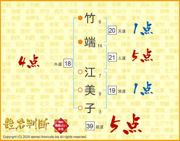 竹(6画)端(14画) 江(7画)美(9画)子(3画)