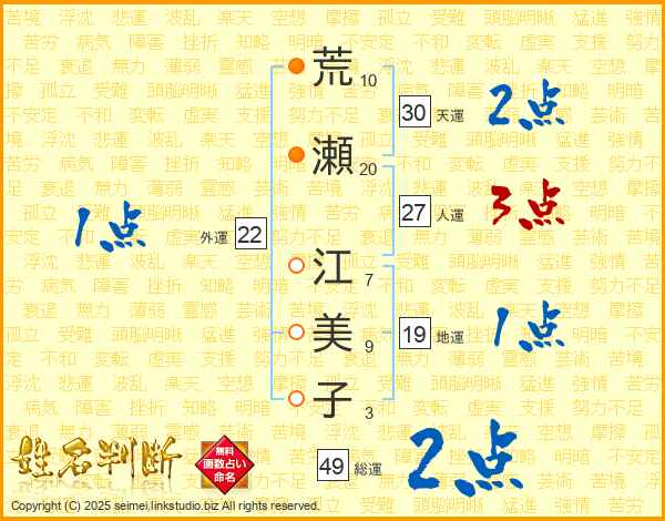 荒(10画)瀬(20画) 江(7画)美(9画)子(3画)
