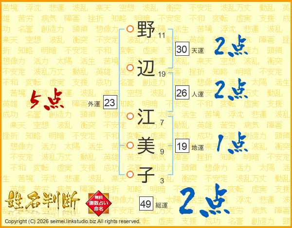 野(11画)辺(19画) 江(7画)美(9画)子(3画)