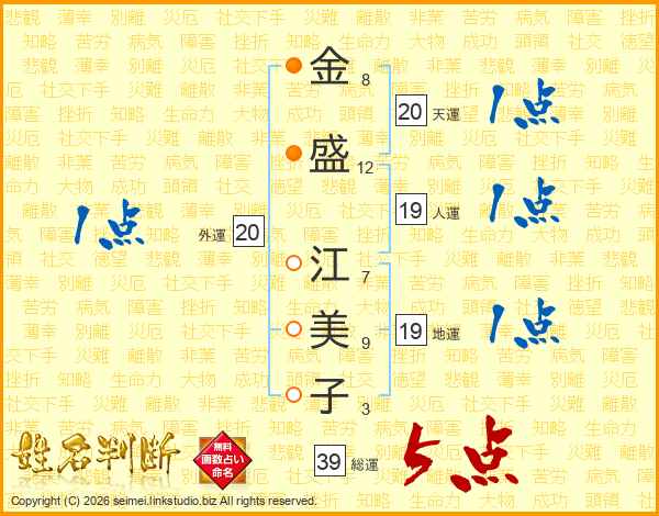 金(8画)盛(12画) 江(7画)美(9画)子(3画)