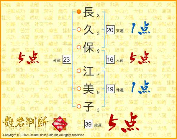 長(8画)久(3画)保(9画) 江(7画)美(9画)子(3画)