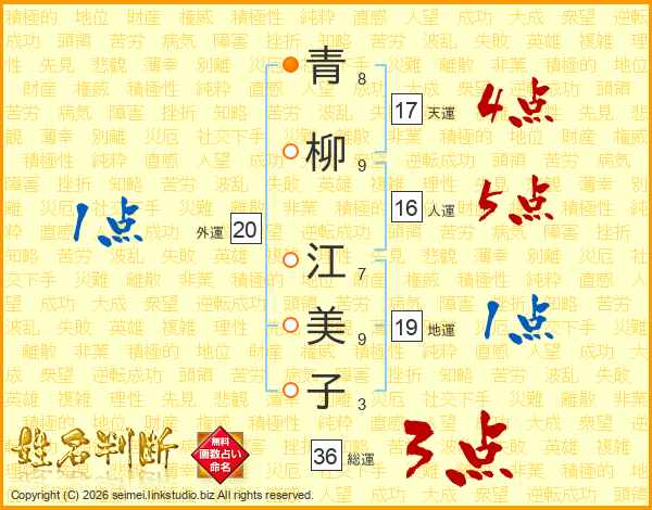 青(8画)柳(9画) 江(7画)美(9画)子(3画)