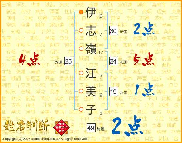 伊(6画)志(7画)嶺(17画) 江(7画)美(9画)子(3画)