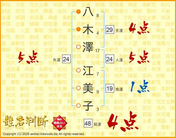 八木澤江美子さんの人運は24画の5点!