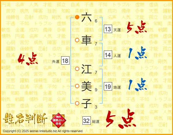 六(6画)車(7画) 江(7画)美(9画)子(3画)