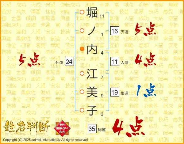 堀(11画)ノ(1画)内(4画) 江(7画)美(9画)子(3画)
