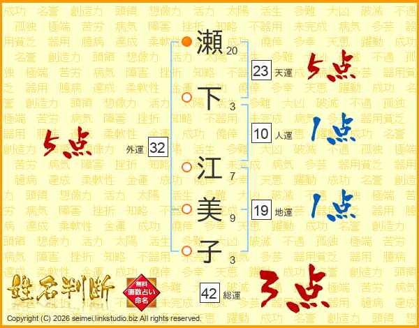 瀬(20画)下(3画) 江(7画)美(9画)子(3画)
