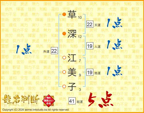 草(10画)深(12画) 江(7画)美(9画)子(3画)